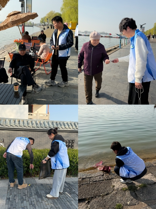 踏着一湖春色,青年们带着饱满的热情投身到志愿服务中。大家兵分两路,一组向湖岸周边商户、参观游客发放水情宣传手册,耐心讲解水资源保护、节水小妙招等知识;另一组则前往洪泽湖堤防沿线,手持垃圾袋、捡拾器等工具,捡拾塑料瓶、包装袋、烟头等生活垃圾及湖岸漂浮物,以实际行动守护河湖环境。志愿者忙碌的身影,成为湖畔一道靓丽的风景。