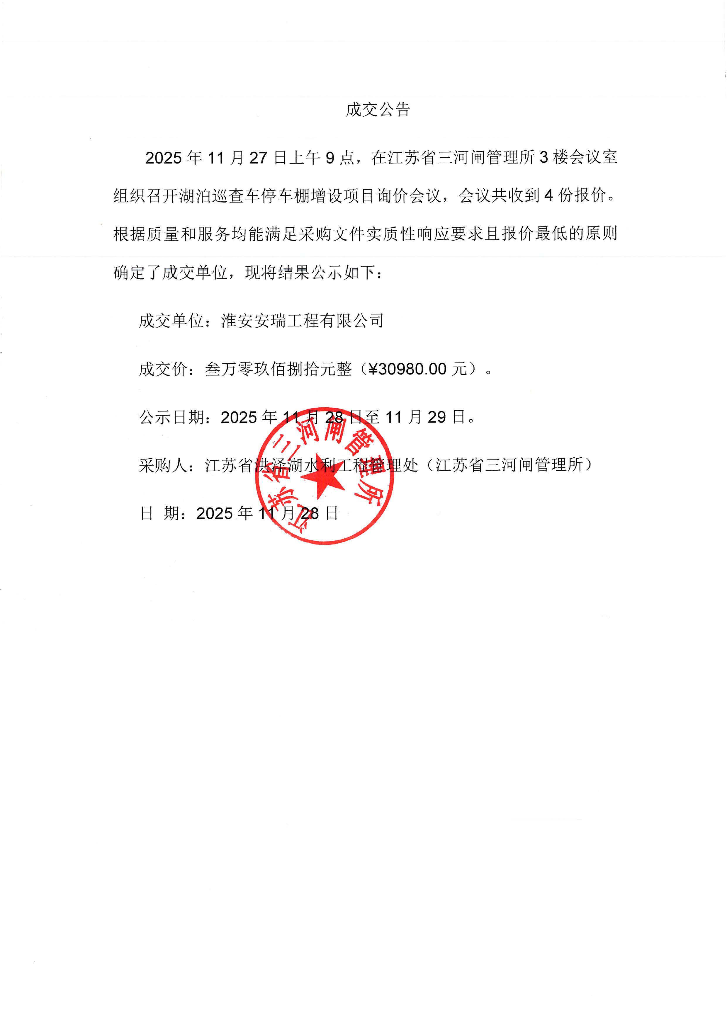 江苏省三河闸管理所湖泊巡查车停车棚增设项目询价结果公告