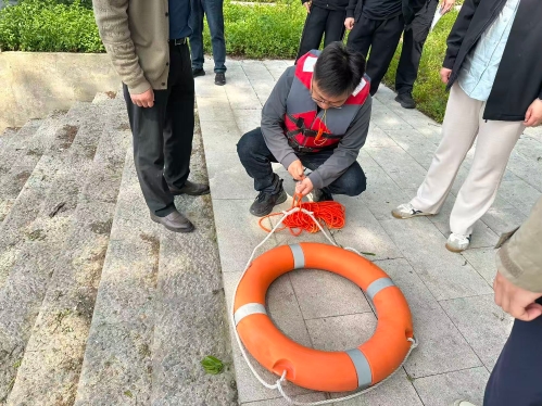 会后,全所职工在礼湖栈道东侧集合,开展水域救生设施应急演练。本次演练在湖中设定一处模拟落水点,由岸上人员负责抛投救生圈。随着“演练开始”的口令,演练人员迅速进入状态,开箱、检查、穿衣、绑绳、抛圈等动作一气呵成,成功将救生圈抛至落水点附近。