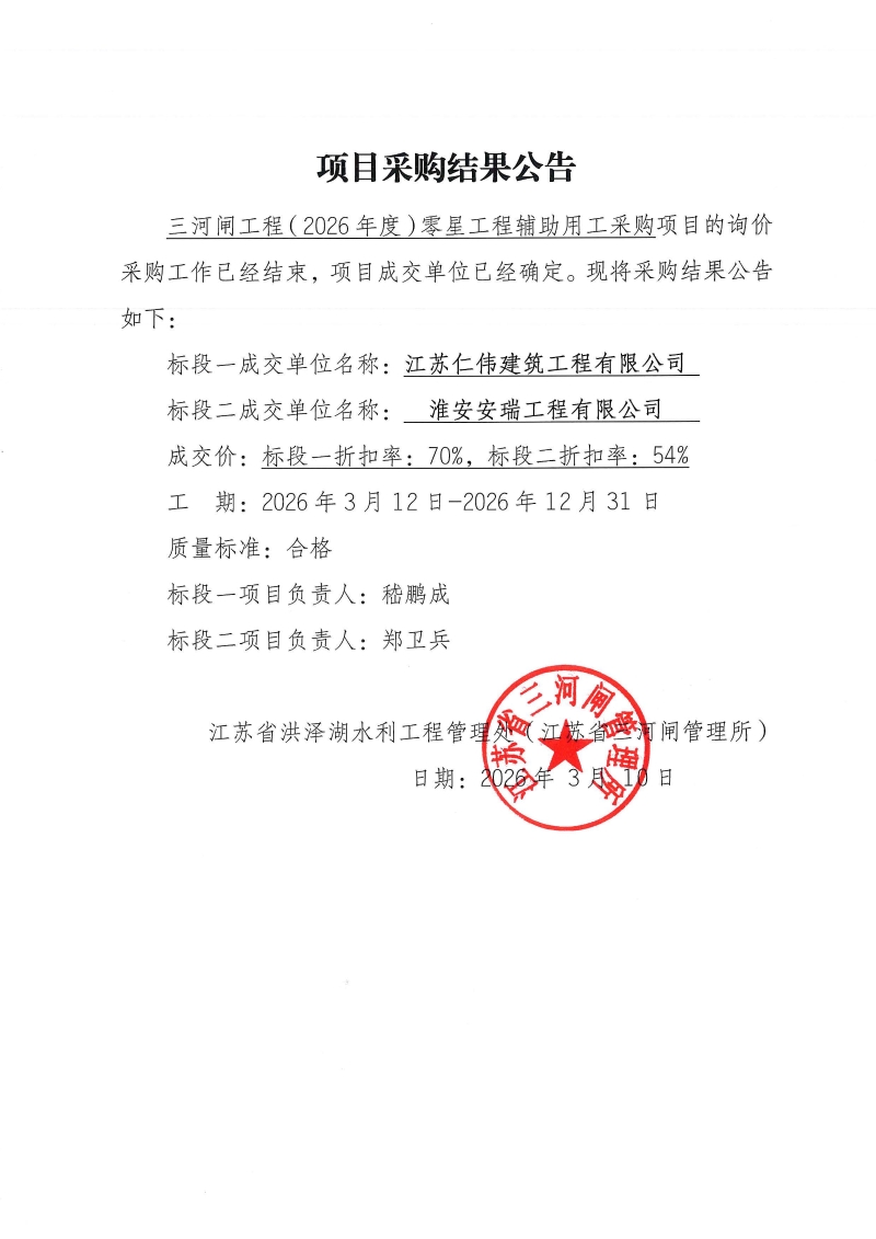 三河闸工程2026年度零星工程辅助用工询价采购结果公告